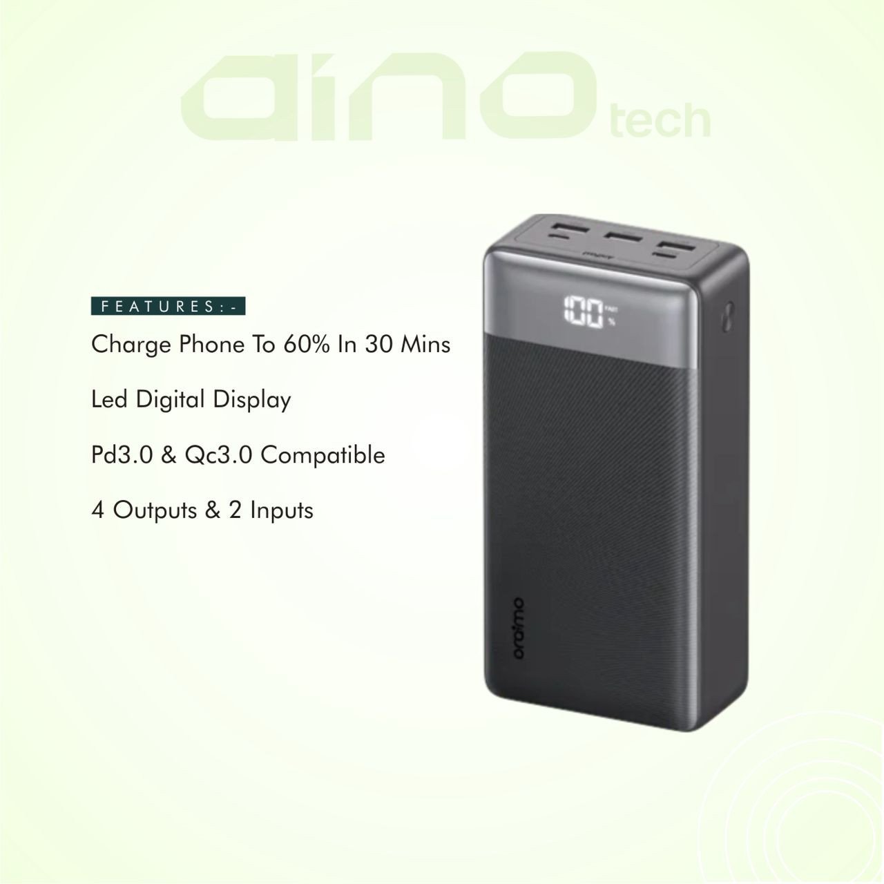 The Oraimo PowerBox 400 40000mAh Power Bank is a high-capacity charging solution equipped with a 40000mAh (148Wh) battery that can charge smartphones up to eight times. It features 22.5W fast charging with PD and QC 3.0 support, ensuring quick power delivery for compatible devices. With five output ports—four USB-A and one USB-C—it allows simultaneous charging of multiple devices. Dual input ports (Type-C and Micro-USB) provide flexible recharging options. A digital LED display shows real-time battery percentage for easy monitoring. The power bank includes a bright built-in LED torch for emergency use. It is built with V0 fireproof material and includes a 15-layer smart protection system for safety and durability. Its sturdy design and ultra-high capacity make it ideal for travel, outdoor activities, and extended device use.
